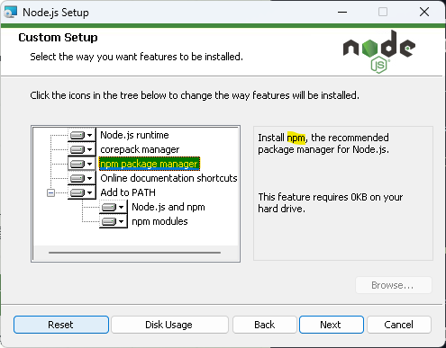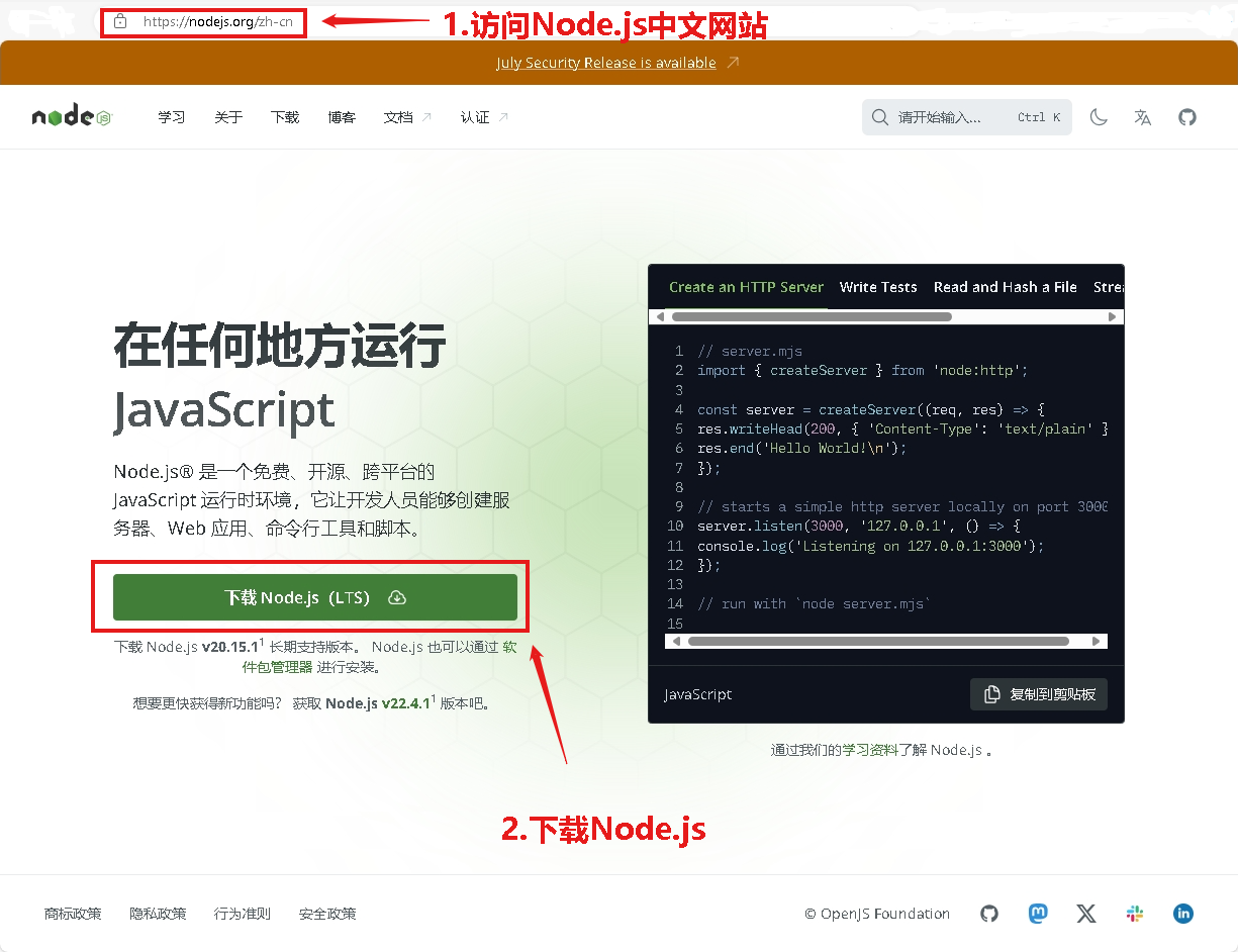 首先在Node.js官网下载Nodejs,版本最新LTS(Long-time Support 长期支持)即可。(一般一直继续即可,请注意标记部分文字,确保npm下载。)