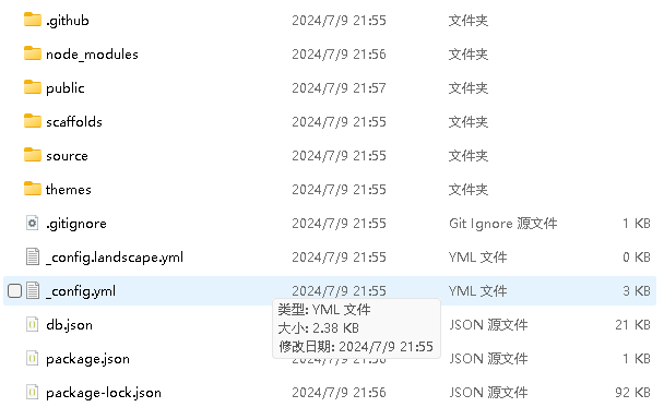 其中, _config.yml为站点配置文件夹,不可以随意更改,以后会经常使用。themes用于存放服务器的主题资源。source存放文章以及页面。scaffolds为生成的静态服务器文件。public为安装的库。