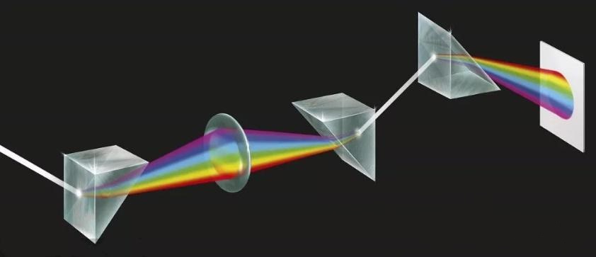 证明:光的色散是指一束太阳光经过三棱镜后,分解成红、橙、黄、绿、蓝、靛、紫等色光的现象。