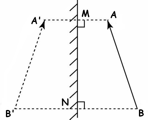 在下图中,MN表示平面镜,AB表示镜前的物体。要做出AB在平面镜中的像,可以作出AB两端点A、B关于镜面的对称点A’、B’,以虚线连接。